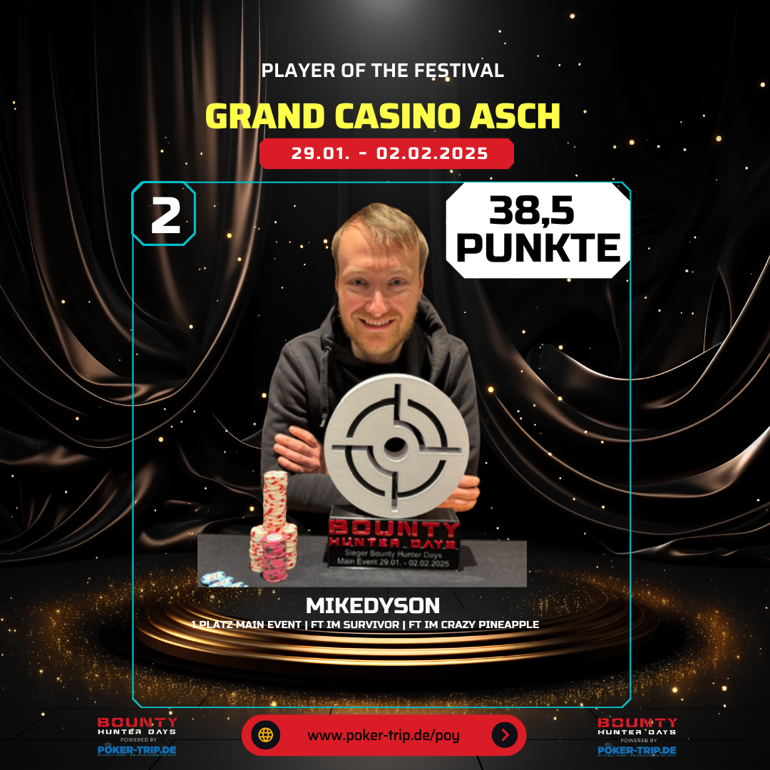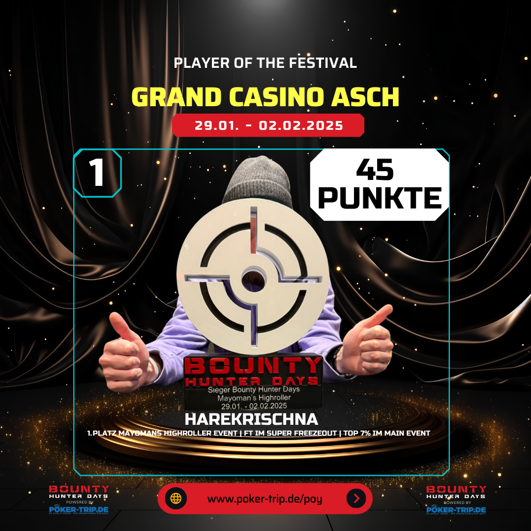 Das große Jahresfinale findet am 29.01.26 um 16 Uhr im Grand Casino Asch statt. Zu gewinnen gibt es Preise im Gesamtwert von >8.000€, welche wir von Poker-Trip.de gesponsert haben.